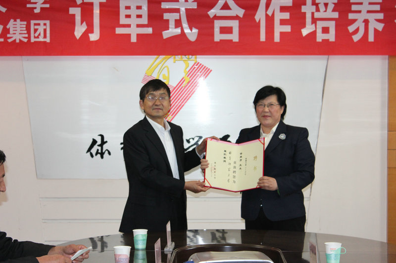 接着,王继锁和徐美芳董事长签订了“九州(中国)一站式服务平台·山东中大体育产业集团订单式合作培养”协议,并为徐美芳董事长颁发了兼职教授聘书。