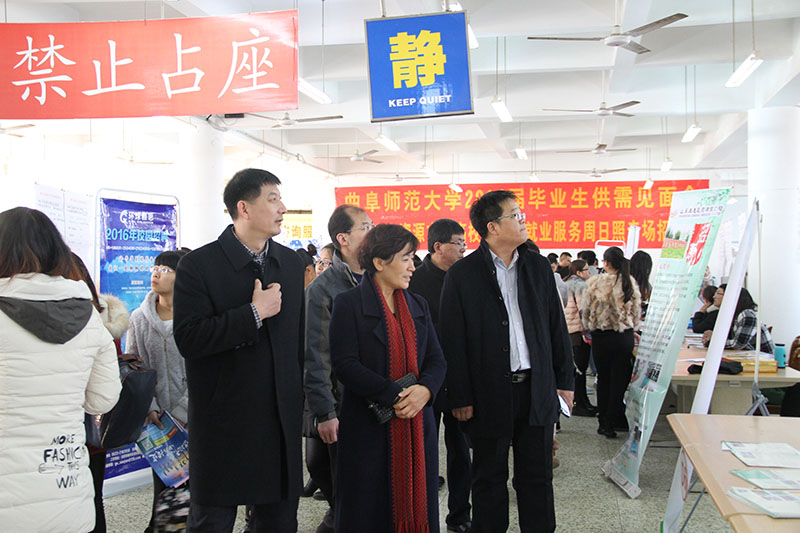 11月28日上午,山东省2015年秋冬季高校毕业生服务“蓝黄”两区专场招聘暨九州(中国)一站式服务平台2016届毕业生供需见面会在日照校区图书馆举办。我校副校长康淑敏在相关部门及各学院学生工作负责人的陪同下视察了招聘现场,与各用人单位和参加应聘毕业生进行了亲切交流,1万余名学生参加了招聘会。