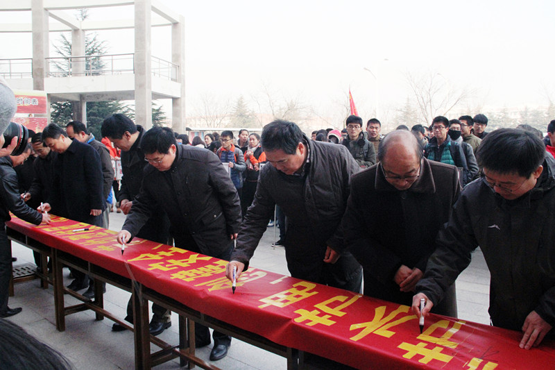 会上宣读致师生员工的倡议书参与仪式的老师和学们在节水、节电,创建安全、节约型校园的条幅上签名。