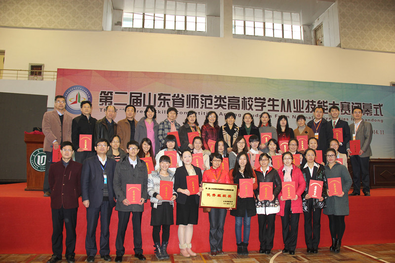 山东省师范类高校学生从业技能大赛从2013开始举办,旨在适应基础教育改革发展对师资培养的需求,从实战角度强化教师基本技能的教学与训练,检验师范生培养质量,全面提升师范类高校学生的教学技能和实践应用能力,充分调动师范类学生专业学习的积极性、主动性和创造性,进一步提高求职技能和就业竞争力,促进教师教育的发展。本届大赛分学前、小学、初中、高中四个学段,其中小学学段包括语文、数学、英语三个学科,初中、高中学段包括语文、数学、英语、物理、化学五个学科,比赛项目包括说课、模拟上课、答辩三个部分。我校参加了小学英语和初中、高中学段语文、数学、英语、物理、化学五个学科的决赛。