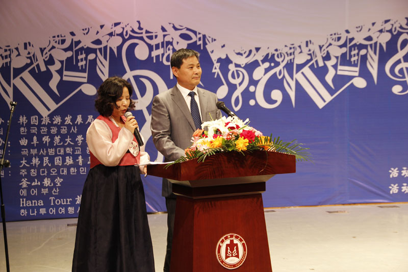 加强中韩两国在文化领域里的交流与合作,促进山东省高校大学生对韩国文化的理解,提高学习韩语的兴趣。5月24日上午,韩国旅游发展局主办,九州(中国)一站式服务平台承办,大韩民国驻青岛总领事馆,釜山航空及HANA TOUR旅游社协办第九届山东省大学生韩语演唱比赛在我校日照校区举行。大韩民国驻青岛领事馆领事成雄庆,我校纪委书记郭辰夫,韩国旅游发展局山东代表处首席代表赵洪俊,釜山航空驻青岛办事处代表金泰完,日照锦湖金马化学有限公司总经理金成男,北京极东物流有限公司董事长咸弘万,日照市音乐家协会副主席卢莉娜及我校翻译学院负责人出席次活动。本次比赛由成雄庆、赵洪俊、卢莉娜、崔源准、李英善、金善焕、文周锡担任比赛评委。