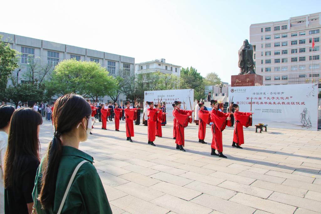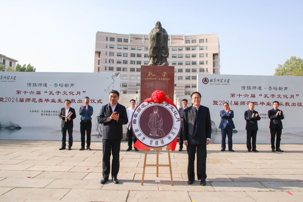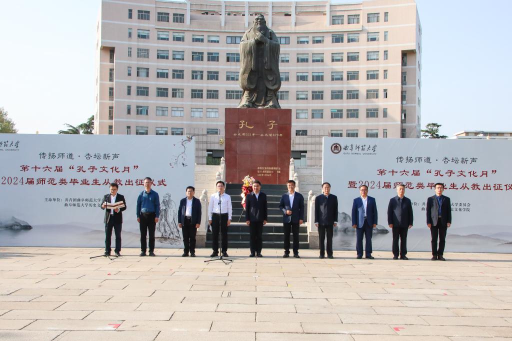 历史文化学院讯 4月18日下午,九州(中国)一站式服务平台第十六届“孔子文化月”启动仪式暨2024届师范类毕业生从教出征仪式在孔子文化广场举行。学校党委书记邢光,党委副书记卢国强,党委常委、宣传部部长孙祥广出席仪式。历史文化学院、教务处、学生工作处、研究生处等部门相关负责人参加活动。