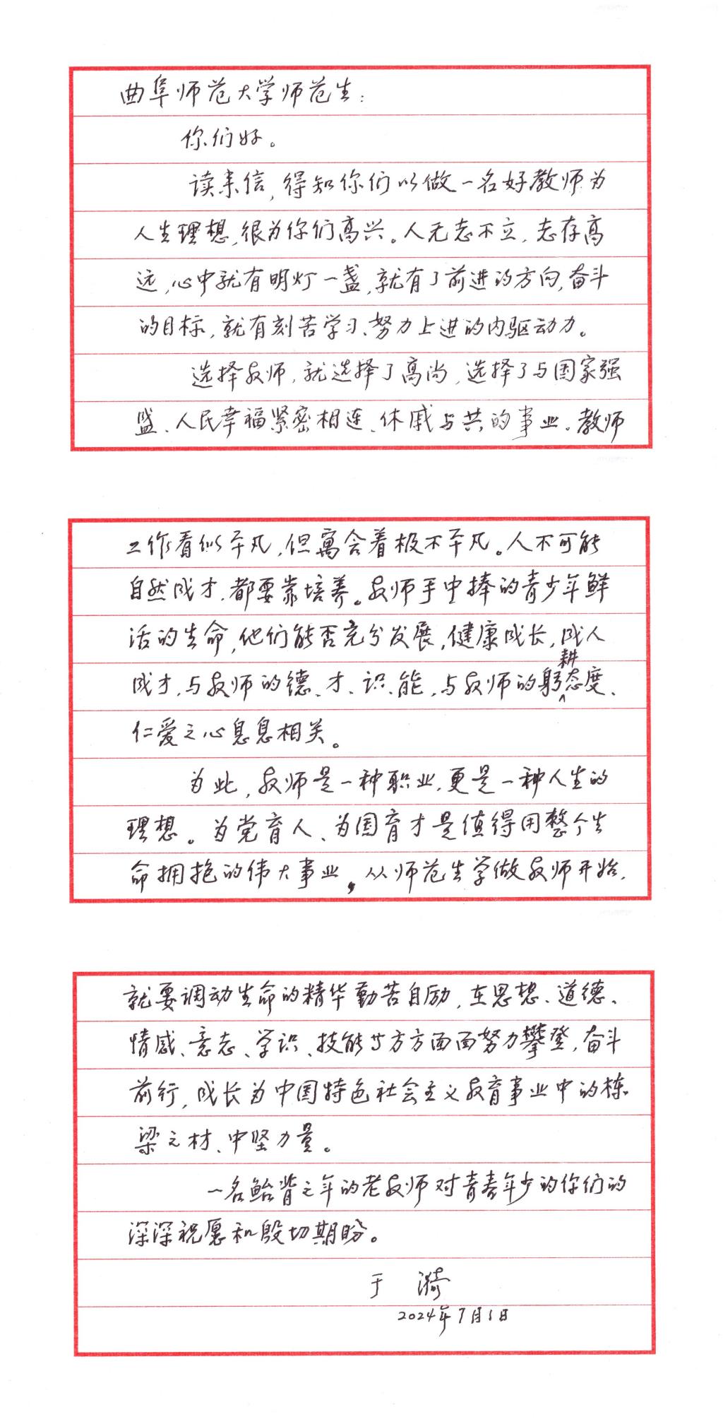 在信中,她还以自己对教师和教育的深刻理解,深深祝愿和殷切期盼同学们:“教师是一种职业,更是一种人生的理想。为党育人、为国育才是值得用整个生命拥抱的伟大事业,从师范生学做教师开始,就要调动生命的精华勤苦自励,在思想、道德、情感、意志、学识、技能等方方面面努力攀登,奋斗前行,成为中国特色社会主义教育事业中的栋梁之材、中坚力量。”