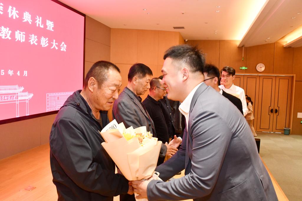 党委副书记、校长张洪海在曲阜校区为从教三十年教师代表颁发荣誉证书