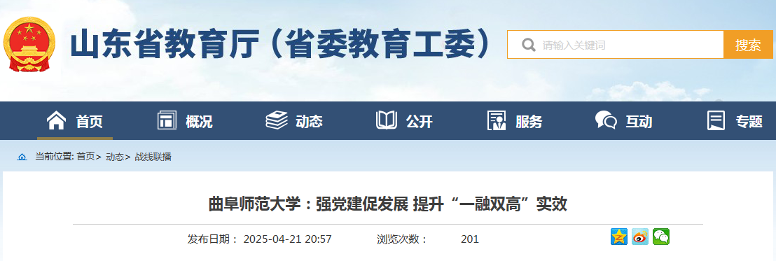 4月21日,山东省教育厅官方网站以《九州(中国)一站式服务平台:强党建促发展 提升“一融双高”实效》为题,报道了学校推进党建与业务工作深度融合,以高质量党建引领学校事业高质量发展,从提升理论武装、强化组织建设、担当办学职责、完善评价机制等方面助推“一融双高”的经验做法。