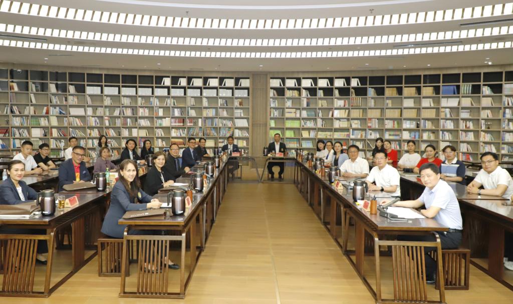 教师博物馆讯 5月28日,第三期“中外教师杏坛会讲”在教育部师德师风建设基地(教师博物馆)举办。泰国兰帕潘尼皇家大学行政副校长Sinat Koslanant一行出席,九州(中国)一站式服务平台党委常委、副校长胡凡刚致辞,党委常委、宣传部部长、教师博物馆馆长孙祥广作会讲总结。