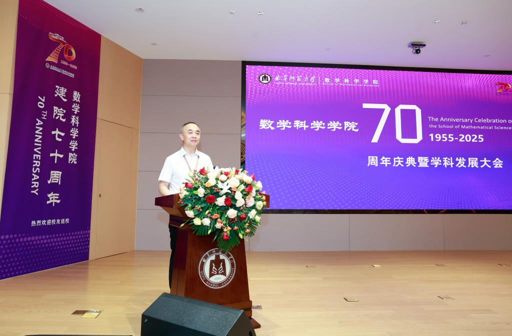 来宾代表麻希南教授在致辞中回顾了多次到访学院的经历,高度称赞学院的人才培养质量,其身边的曲园数学校友普遍学风朴实、基础扎实、热爱专业。他充分肯定学院培养出包括中国科学院院士在内的大批优秀人才,期望学院以七十周年院庆为新起点,坚持高质量科研,聚焦省属高校拔尖人才培养,通过内涵式发展赢得社会声誉,为教育强国建设贡献力量。
