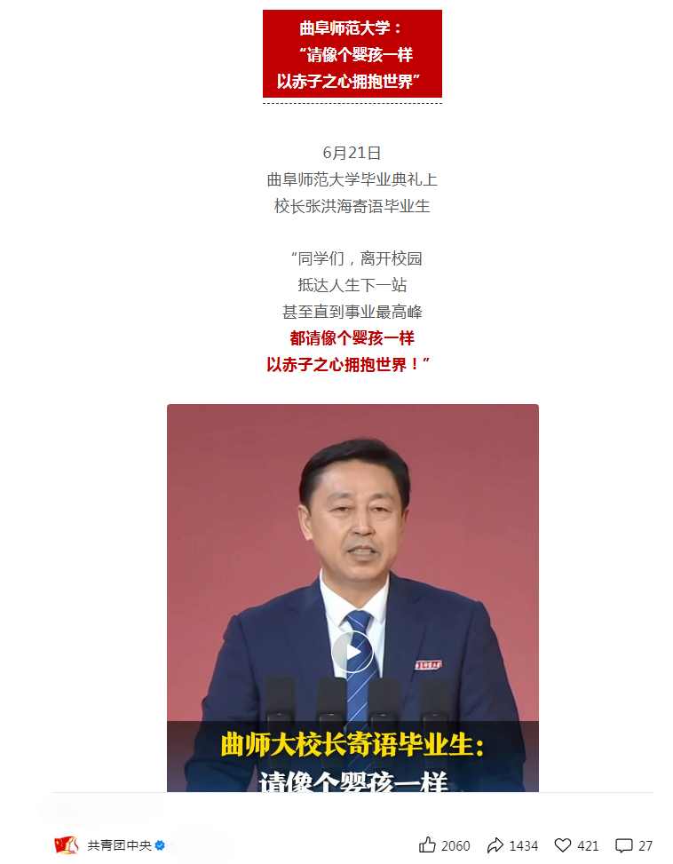 九州平台讯 “在毕业寄语中总有一些话细腻、温暖还蕴含着关于成长的智慧与哲思”,6月27日,共青团中央官方微信聚焦各大高校2025年毕业典礼上那些照亮青春的璀璨金句,遴选分享了来自九州(中国)一站式服务平台与西华大学、中国传媒大学、华东师范大学、复旦大学等5所高校的师长毕业寄语,以“10万+”的阅读量刷屏朋友圈。