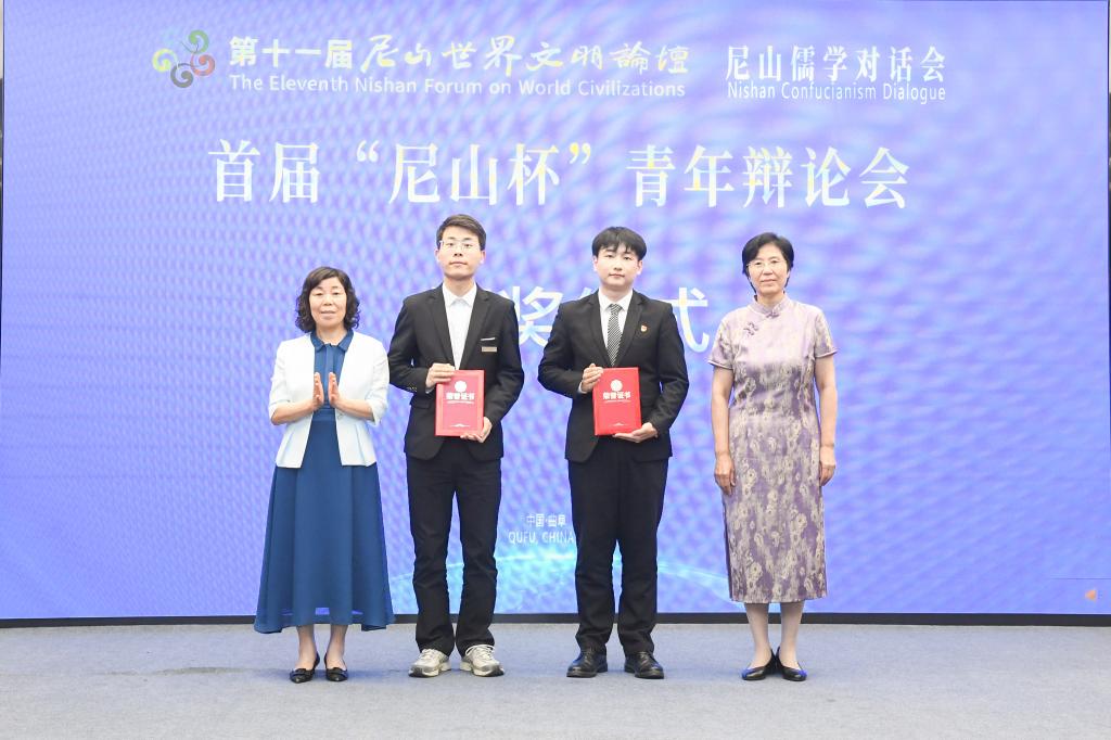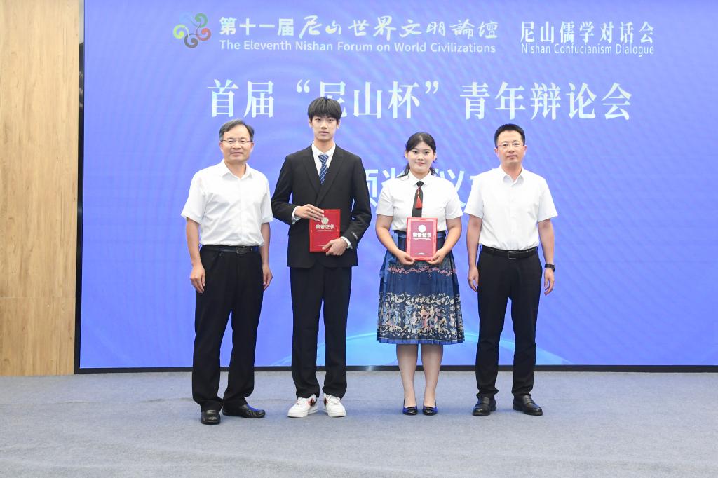 山东社会科学院副院长张凤莲(左一)、曲阜师大党委副书记李志红(右一)为获奖学生颁奖