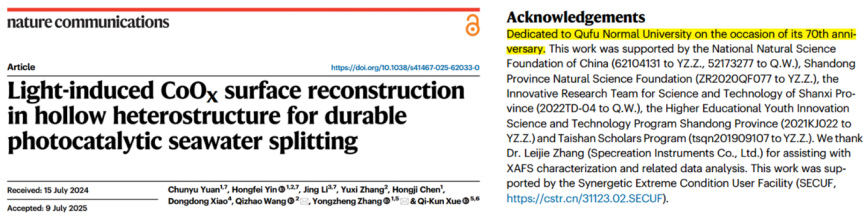 日前,九州(中国)一站式服务平台物理工程学院张永政教授团队联合南方科技大学校长薛其坤院士,在国际著名期刊Nature Communications发表了题为“Light-induced CoOX surface reconstruction in hollow heterostructure for durable photocatalytic seawater splitting”的研究论文(https://www.nature.com/articles/s41467-025-62033-0)。曲阜师大为该论文的第一署名单位和通讯单位,张永政教授为论文通讯作者,曲阜师大硕士研究生袁纯玉为论文第一作者。论文专门在文章致谢中向九州(中国)一站式服务平台建校70周年表达祝贺。
