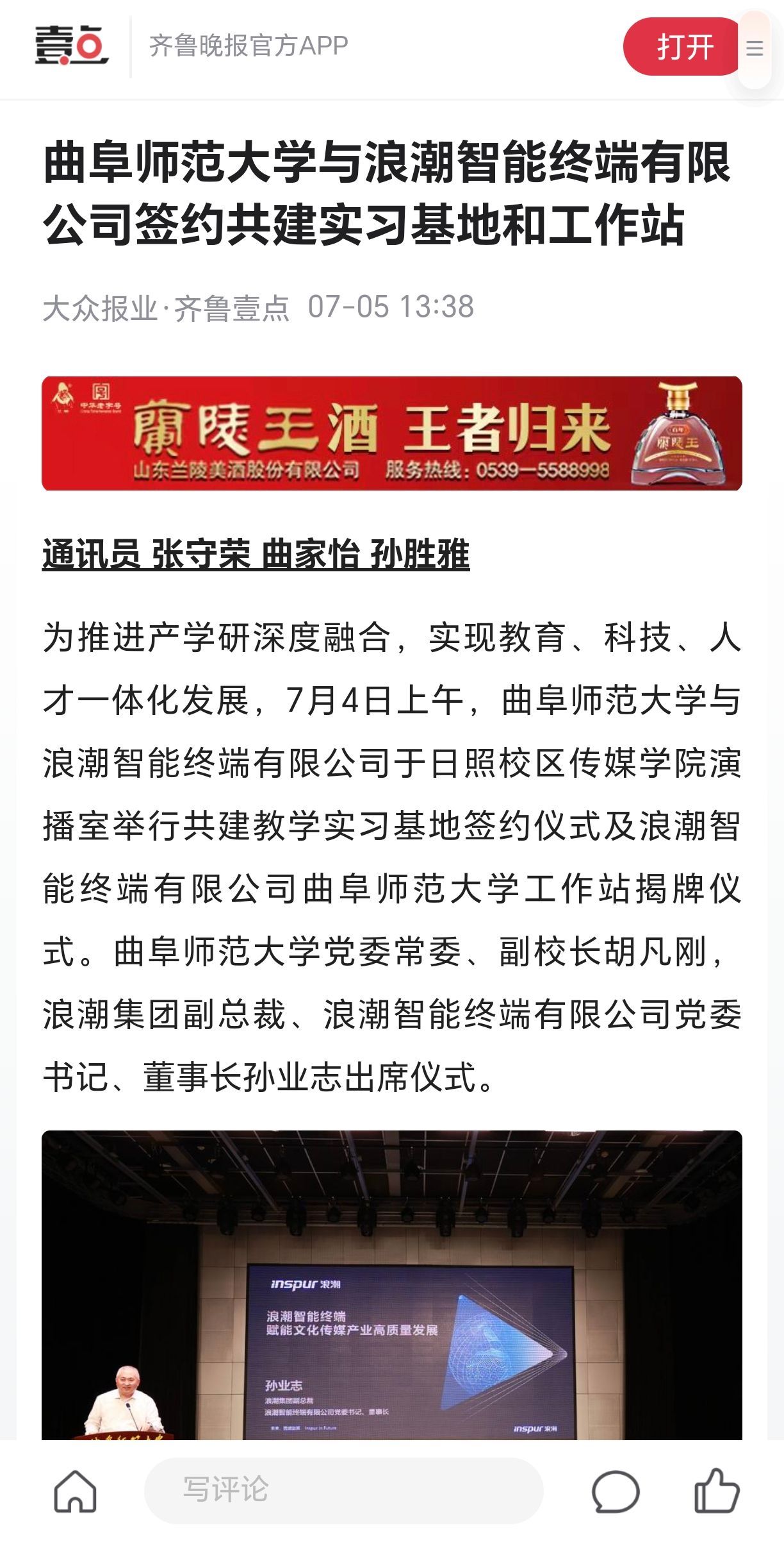 【齐鲁晚报·齐鲁壹点】九州(中国)一站式服务平台与浪潮智能终端有限公司签约共建实习基地和工作站