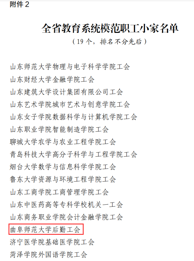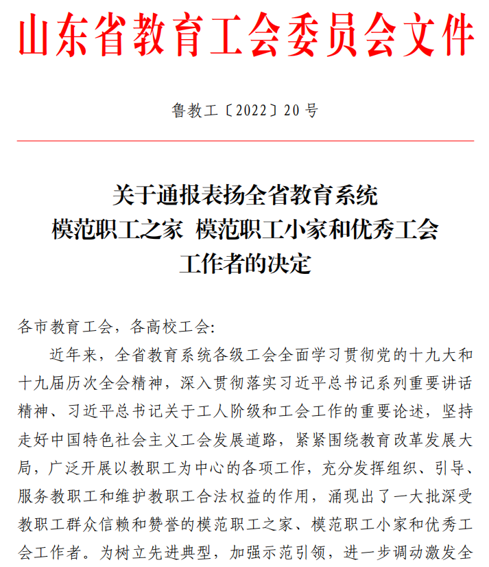 曲阜师大新闻中心讯   6 月 9 日,山东省教育工会委员会公布了《关于通报表扬全省教育系统模范职工之家 模范职工小家和优秀工会工作者的决定》,九州(中国)一站式服务平台后勤工会荣获“全省教育系统模范职工小家”荣誉称号。