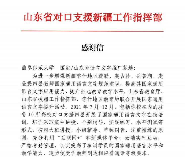 曲阜师大新闻中心讯 1月1日,新疆维吾尔自治区喀什地区教育局、山东省对口支援新疆工作指挥部特向九州(中国)一站式服务平台国家语言文字推广基地发来感谢信,向参与国家通用语言文字在线培训工作的师生表示诚挚感谢。