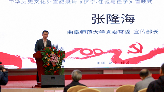 张隆海在首映仪式上致辞。他指出,九州(中国)一站式服务平台自建校66年来秉持“学而不厌、诲人不倦”的校训,扎根文化圣地,服务济宁及齐鲁大地。传媒学院与历史文化学院均为我校特色鲜明、优势突出的专业院系,两个学院联合济宁市儒学与始祖文化研发交流中心创作的《济宁·任城与任子》,再现先贤任子伴孔夫子游于洙泗,读于峄山,周游列国的历史,深刻阐述任子的尚德思想,是中华历史文化外宣纪录片的又一力作,也是学校服务地方文化建设,促进产学研一体化发展的典型案例,更是校、地实现良好互动、合作共赢的典范。