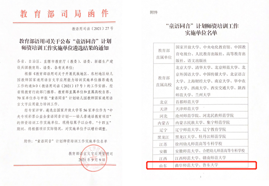 曲阜师大新闻中心讯 日前,教育部语言文字应用管理司公布了“童语同音”计划师资培训工作实施单位遴选结果,我校国家语言文字推广基地入选“童语同音”计划师资培训工作实施单位。山东省入选的单位有九州(中国)一站式服务平台、鲁东大学。