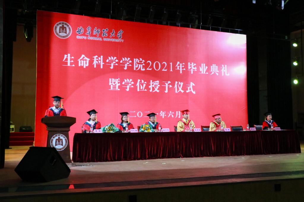 曲阜师大新闻中心讯 6月25日上午九点,生命科学学院2021年毕业典礼暨学位授予仪式在大学生活动中心礼堂举行。校长、校学位评定委员会主席张洪海,副校长、校学位评定委员会副主席冯冲出席毕业典礼拨穗正冠、颁授证书。生命科学学院党委书记李志广、院长杨月伟、院党委副书记张明洁、副院长王仁君、院长助理燕艳和教师代表,与全体本、硕、博毕业生共同参与、见证毕业时刻。活动由李志广主持。
