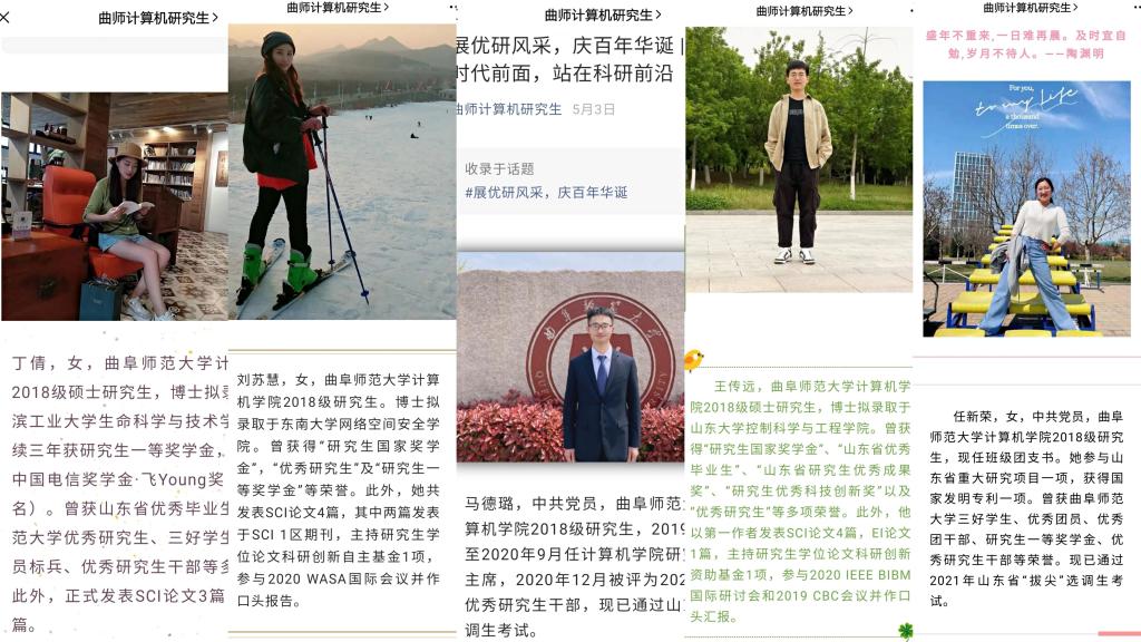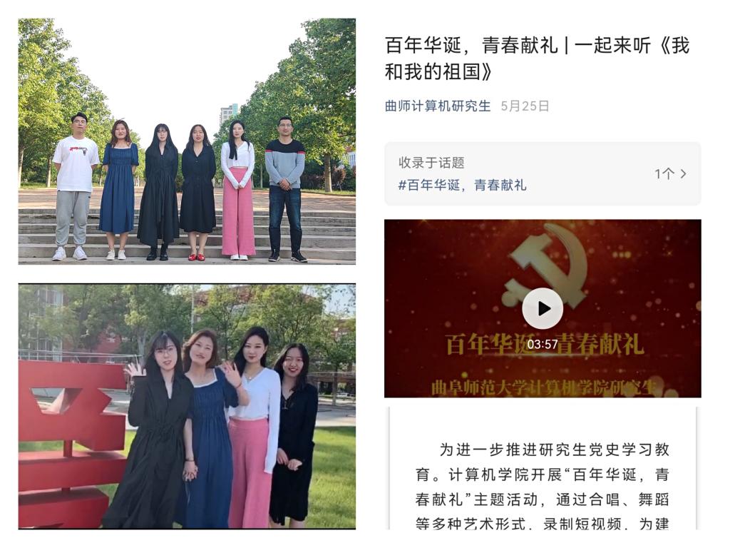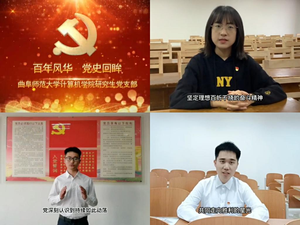 曲阜师大新闻中心讯 在庆祝中国共产党百年华诞的时刻,为激励和引导全院师生坚定理想信念,践行用“青春梦”托举“中国梦”的伟大实践。计算机学院研究生党支部依托“党史学习教育”推出“庆百年”系列微视频。微视频分为“百年风华 党史回眸 – 我来讲党课”,“百年华诞 青春献礼 – 网络文艺汇演”和“庆百年华诞 展优研风采 – 优秀研究生风采展”三个系列。微视频一经推出,受到全院师生的广泛好评。