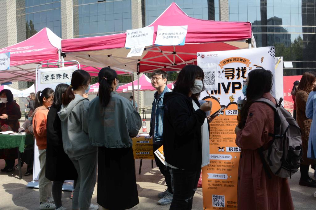 招聘会现场,各用人单位纷纷亮出岗位需求、晒出待遇福利,曲园学子积极向用人单位进行咨询,投递求职简历,约定面试和试讲相关事宜。化学与化工学院毕业生蒋清薪表示,走到大活广场的招聘会现场,想起2017年作为新生进入校门的时光,当时觉得曲园很大,怎么也走不到头,现在觉得曲园很小,这一路也就承载了4年光阴。今天来到招聘会,没有想象中困难,和大学生活中的许多面试没有什么不同,比如社团面试、参加比赛做汇报展示自己等等,许多活动和比赛都无形中培养和提高了我们应对面试的能力。我作为烟台的生源,去青岛工作离家近、前景好,青岛市将招聘会开在校园里,实现了我们不出校门就能找到工作的愿望。目前我已经有了意向就业单位,我也鼓励自己能够努力适应工作环境,认真对待每一项工作任务,在工作中实现自己的价值,不负时光、不负曲园。