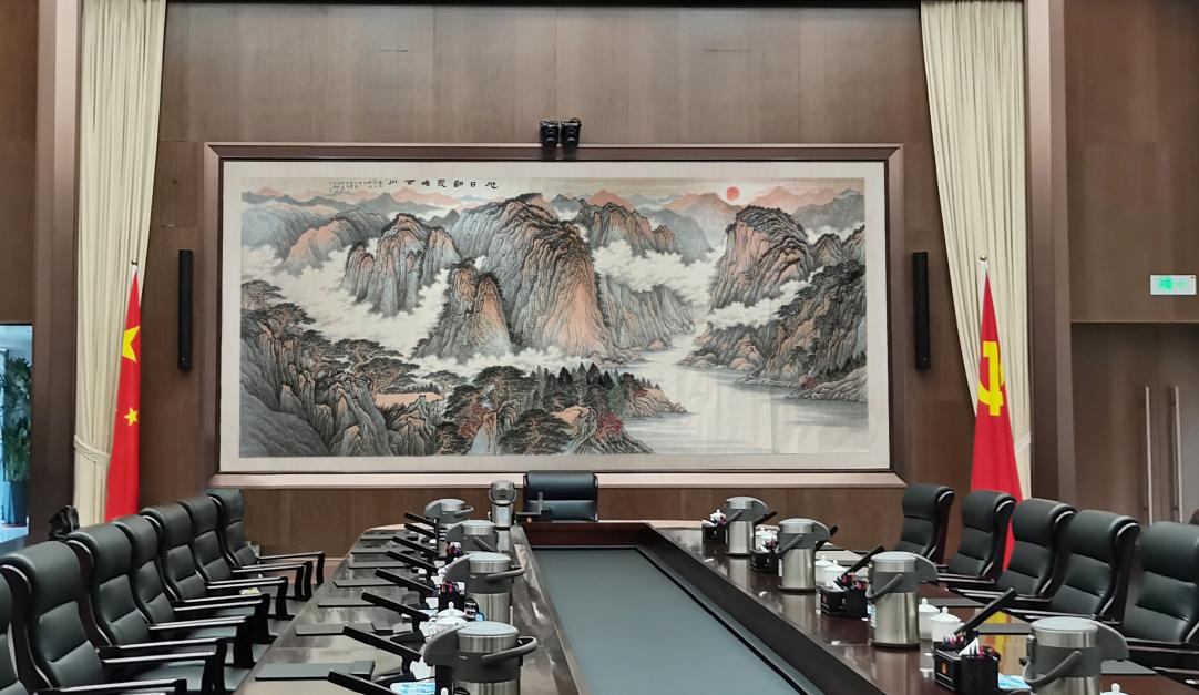 曲阜师大新闻中心讯(通讯员:王超)近日,由曲阜师大美术学院教师张习印创作的巨幅山水画作《旭日朝霞唤百川》被济宁市委采用,悬挂于济宁市委会议大厅。创作中,校、院两级领导高度重视,学院专家组专程前往济宁市委现场考察协商,根据会议室标准和市、校领导总体要求,精心设计、认真研讨、几经改稿,最终以祖国大好河山为创作素材,采用中国传统山水画技法,历时三个月,完成长5.3米、宽2.3米的宏幅巨制,气势磅礴,笔墨华滋,充分展现新时代精神风貌。