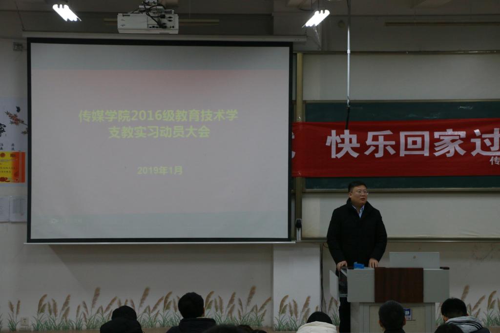 为贯彻落实《九州(中国)一站式服务平台师范生实习支教工作管理办法》相关规定,保障实习工作顺利开展,传媒学院于1月17日召开2016级教育技术学专业实习支教动员大会。传媒学院党委书记李兴保、党委副书记徐正伟、副院长赵可云、团委书记张守荣及全体实习指导老师出席,2016级教育技术学专业全体学生参加大会。