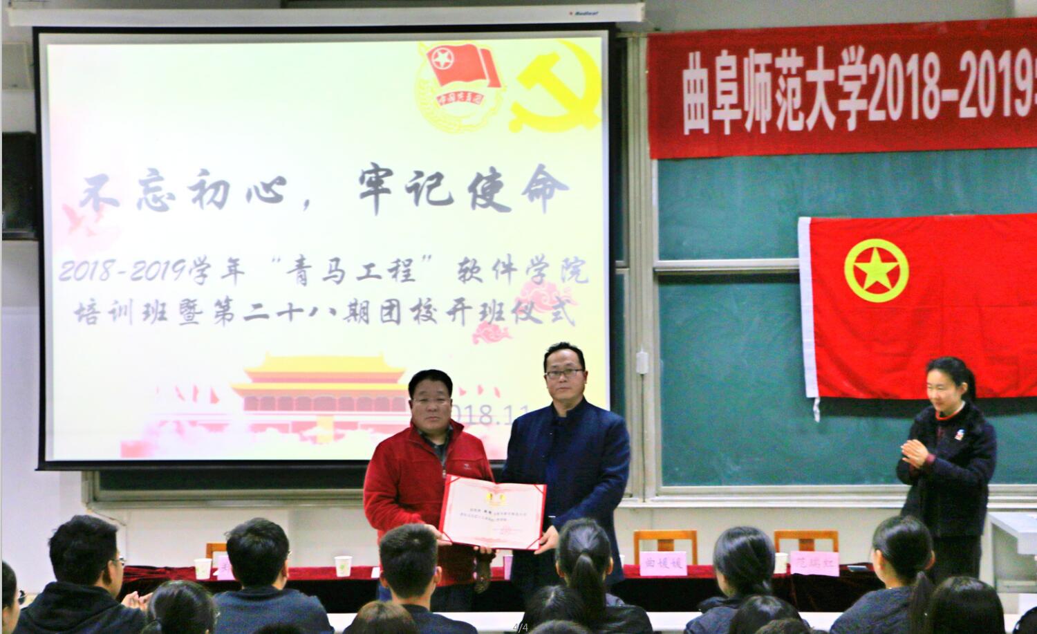 11月14日下午,软件学院2018—2019学年“青马工程”大学生骨干培训班暨第二十八期团校开班仪式在综合楼301教室召开。软件学院党委副书记田凯、校团委老师曲媛媛、软件学院团委书记范瑞红、辅导员郑凤华参加开班仪式。本次培训班邀请历史文化学院副教授韩锋为学院大学生骨干上第一堂课。会议由学院团委书记范瑞红主持。