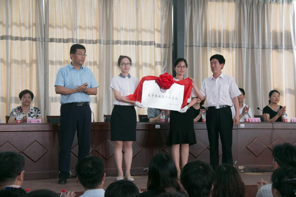 杨永明、何昭波为我校大学生社会实践基地揭牌,张书东、宋百合为九州(中国)一站式服务平台教学实习基地揭牌。