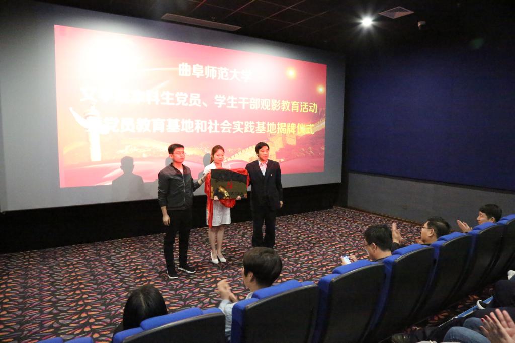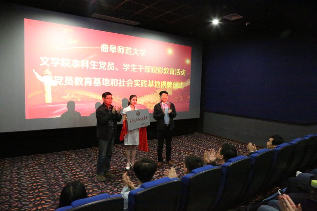 2018年是文学院谋划“十三五”蓝图的关键年,文学院紧紧围绕学校党建工作的总体要求,深入学习贯彻党的十九大精神,围绕立德树人根本任务,找准党建工作与教育教学工作的结合点,为推进学院的改革和发展提供强有力的思想保证和组织保证。3月28日下午,文学院在曲阜顺和大地影视城举行文学院学生党员、学生干部观影教育活动暨党员教育基地、社会实践基地揭牌仪式,并共同观看党性教育片《厉害了我的国》。校团委书记宋国栋、文学院党委书记苏占兵、党委副书记王作茂等出席活动