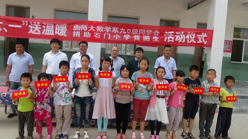 石门小学位于我校帮扶的泗水县泗张镇石门庄村,地处山区,地理位置偏僻,贫困学生较多。派驻石门村第一书记刘建新,积极联络同学发起倡议,为困难小学生筹得捐款六千元。选择了家庭困难,品学兼优的12名小学生给予资助,每人500元,一定程度上缓解了他们生活的困难。