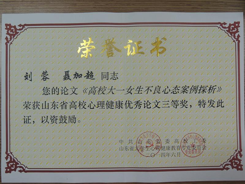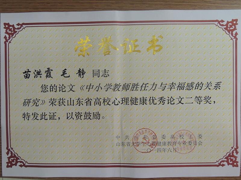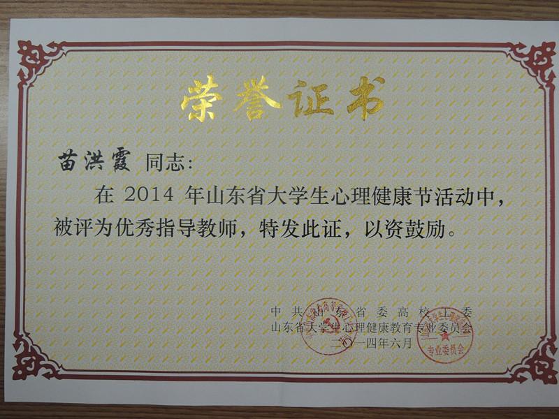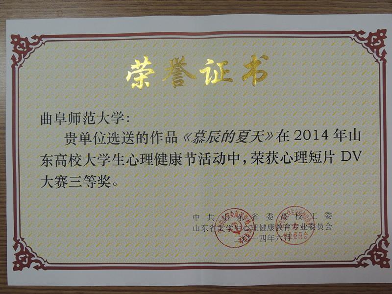 6月6日,山东省大学生心理健康教育专业委员会2014年学术年会在聊城大学召开,山东省委高校工委副书记黄琦出席会议并讲话。会议对2014年山东高校大学生心理健康节优秀组织单位、优秀指导教师、获奖项目及获奖作品进行表彰。我校心理健康中心主任苗洪霞老师被评为山东省大学生心理健康教育优秀指导教师,苗洪霞、刘蓉老师的两篇论文分获心理健康教育论文二、三等奖,心理DV作品《慕辰的夏天》获得心理短剧DV大赛三等奖。