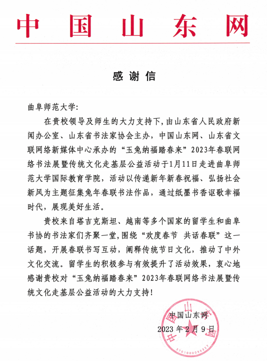 曲阜师大国际教育学院讯  日前,由山东省人民政府新闻办公室主管的中国山东网向曲阜师大发来感谢信,对我校国际教育学院师生积极参与由山东省人民政府新闻办公室、山东省书法家协会主办的“玉兔纳福踏春来”2023年春联网络书法展暨传统文化走基层公益活动表示诚挚的感谢。