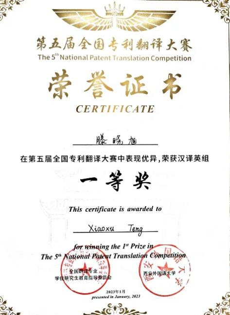 全国专利翻译大赛由全国翻译专业学位研究生教育指导委员会、中国专利信息中心、陕西省知识产权局指导,旨在进一步强化我国知识产权保护,推动知识产权与翻译学科紧密融合,在全社会夯实知识产权语言服务人才培养根基。大赛设英译汉、汉译英两个赛道,来自海内外1300余所高校和社会组织机构的选手参加了大赛。