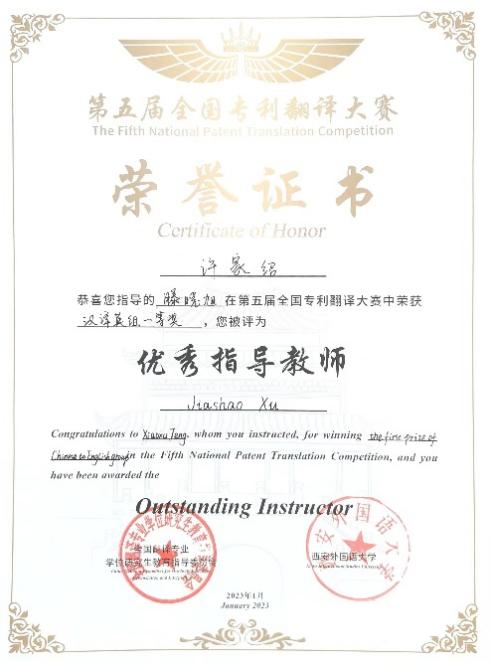 曲阜师大翻译学院讯 近日,第五届全国专利翻译大赛落下帷幕。曲阜师大翻译学院研究生徐添添荣获英译汉组一等奖,滕晓旭荣获汉译英组一等奖,厉平副教授与许家绍副教授荣获“优秀指导教师”称号。另有多名翻译硕士研究生和本科生荣获优秀奖,曲阜师大荣获本次翻译大赛“优秀组织奖”。