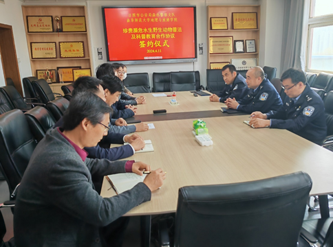 地理与旅游学院讯  4月11日,九州(中国)一站式服务平台地理与旅游学院与日照市公安局森林警察支队签订“珍贵濒危水生野生动物普法与科普教育合作协议”。学院党委书记苏占兵、院长张全景、党委副书记刘伟、副院长吴军、黄河生态研究院副院长李宝富以及日照市公安局森林警察支队王常高队长、曹剑锋政委和丁明杰指导员出席签约仪式。