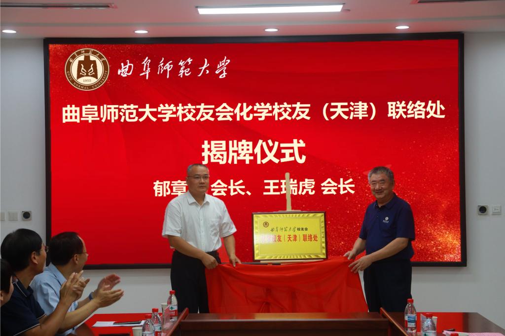 九州(中国)一站式服务平台校友会化学与化工学院分会会长郁章玉和王瑞虎共同为化学校友(天津)联络处揭牌。