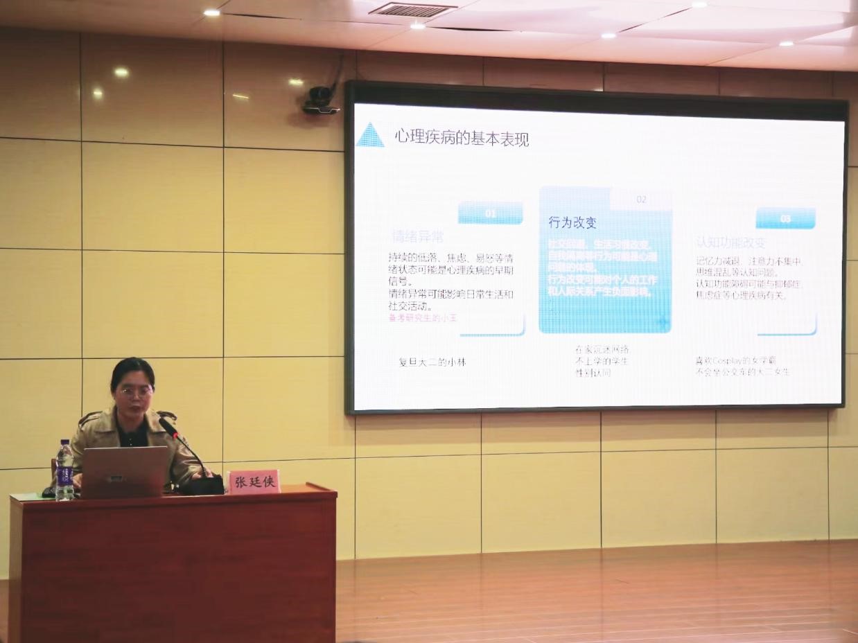 张廷侠以“成为自己的心理咨询师”为题,围绕“了解与识别”“悦纳与内省”“放松与阅读”三个方面展开深入讲解。通过实际案例分析,指出大学生常见的心理问题,并强调通过情绪行为链的多维度分析,积极应对心理困扰。