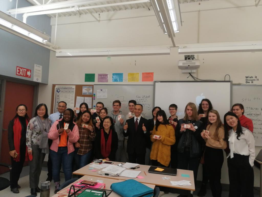 在加期间,代表团观摩了我校派出的汉语教师志愿者陈俊锋的中文课堂,看望了我校在孔子学院任教的公派教师和学生志愿者,了解他们的生活和工作状况,鼓励他们努力工作,圆满完成学校交给他们的光荣任务,不辜负学生和家长对他们的殷切期望;另外,代表团还应邀参加了由加皇国际教育集团董事长、新省孔院理事会主席彭建华(Francis Pang)先生为约翰·麦克劳林(John McLaughlin)副部长组织的退休恳谈会,参加恳谈会的有新省原省长、现任教育部副部长助理、大西洋国际教育集团副总裁等有关人员,代表团向与会人员介绍了我校情况。