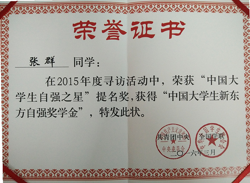 • 我校学子张群荣获“2015年度中国大学生自强之星”提名奖
